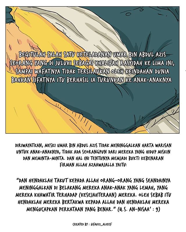 “Sesungguhnya wasiatku kepada anak-anakku hanyalah Allah yang telah menurunkan kitab Alquran sebagai kebenaran dan Dia-lah yang melindungi orang-orang yang shalih. Jika mereka menjadi orang yang shalih dan bertakwa, Allah akan mencukupinya dengan karuniaNya dan Dia akan menjadikan jalan keluar bagi setiap kesulitan yang dihadapi. Namun jika mereka durhaka dan berkubang maksiat, maka sekali-kali aku tidak mau menjadi orang yang membantu mereka dengan harta untuk bermaksiat kepada Allah!.” ~’Umar bin ‘Abdul ‘Azis